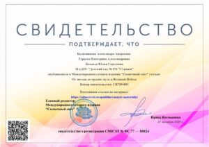 Педагогическое кредо: «Воспитатель — это волшебник, который открывает детям дверь в мир взрослых. И от того, что знает и умеет воспитатель, зависит и то, чему и как он научит своих воспитанников». К. Гельвеций