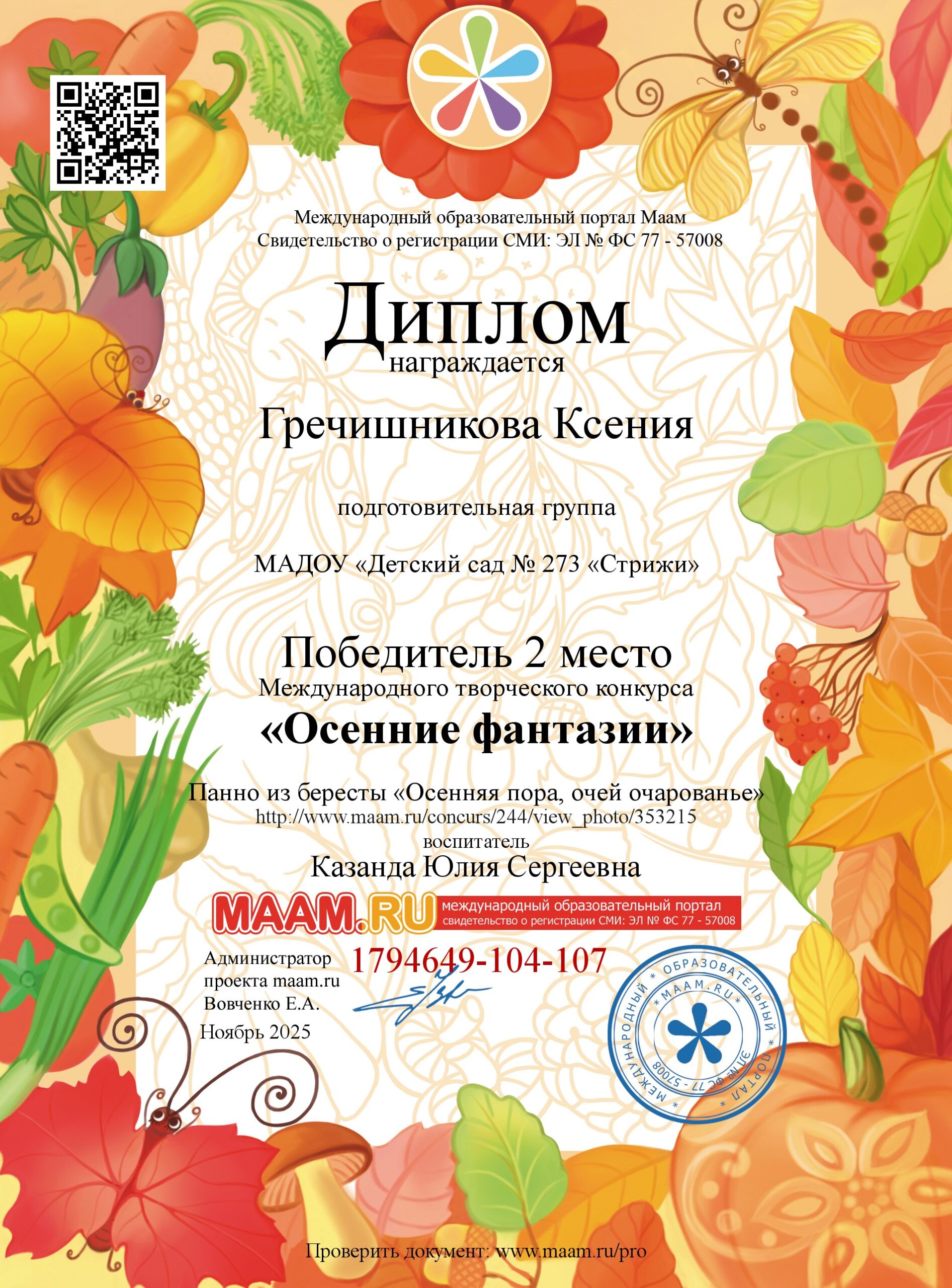 Диплом профессиональной переподготовки: «Воспитатель детей дошкольного возраста», АНО ДПО «УрИПКиП», 2022